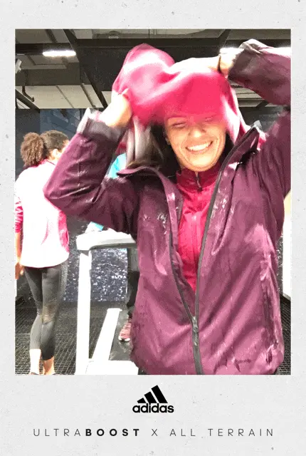 - 1 photobooth avec personnalisation extérieure aux couleurs Adidas, installé devant un tapis de course et sous un rideau de pluie